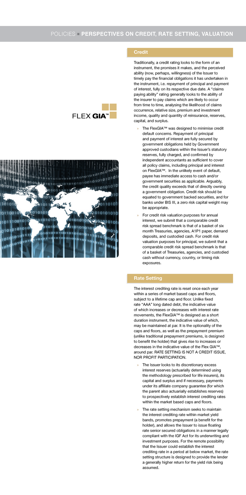 A portfolio of FlexGIA™ may provide diversification in interest crediting rates with an agreed lifetime and annual cap and floor structure, as well as providing diversification in timing of prepayment and its"look back make whole" prepayment premium feature.