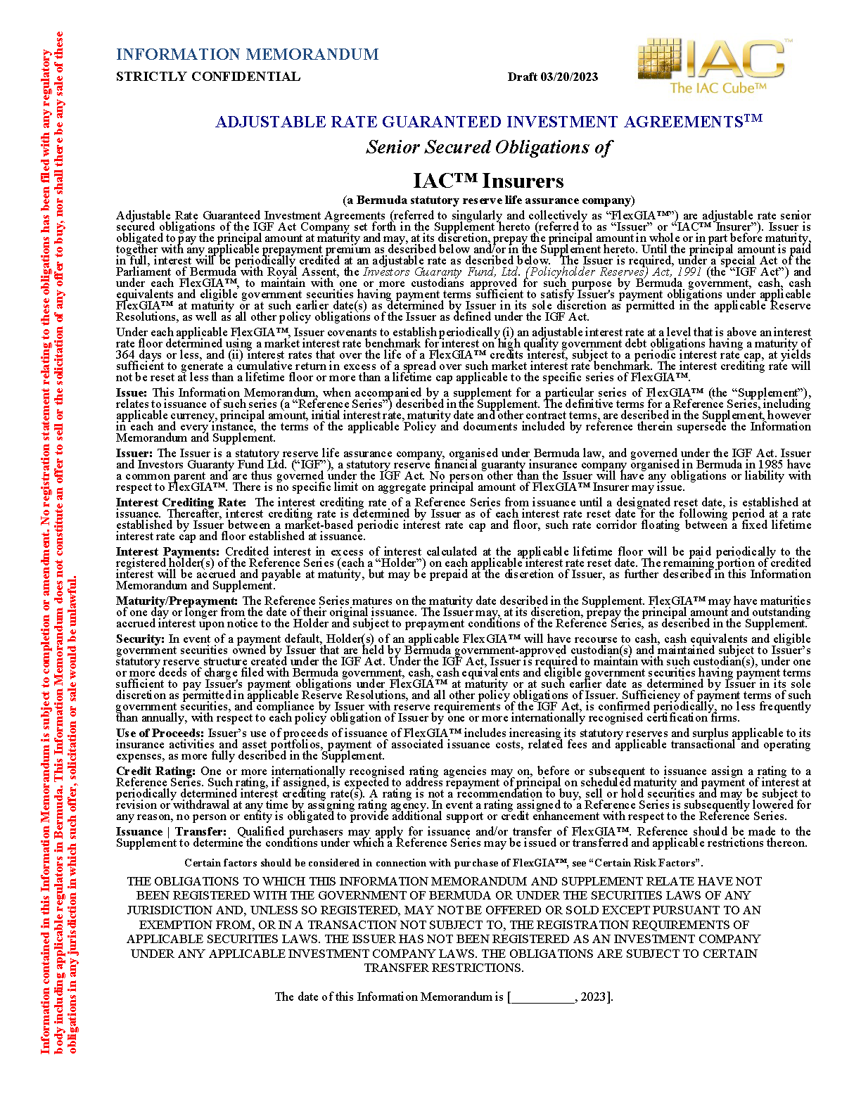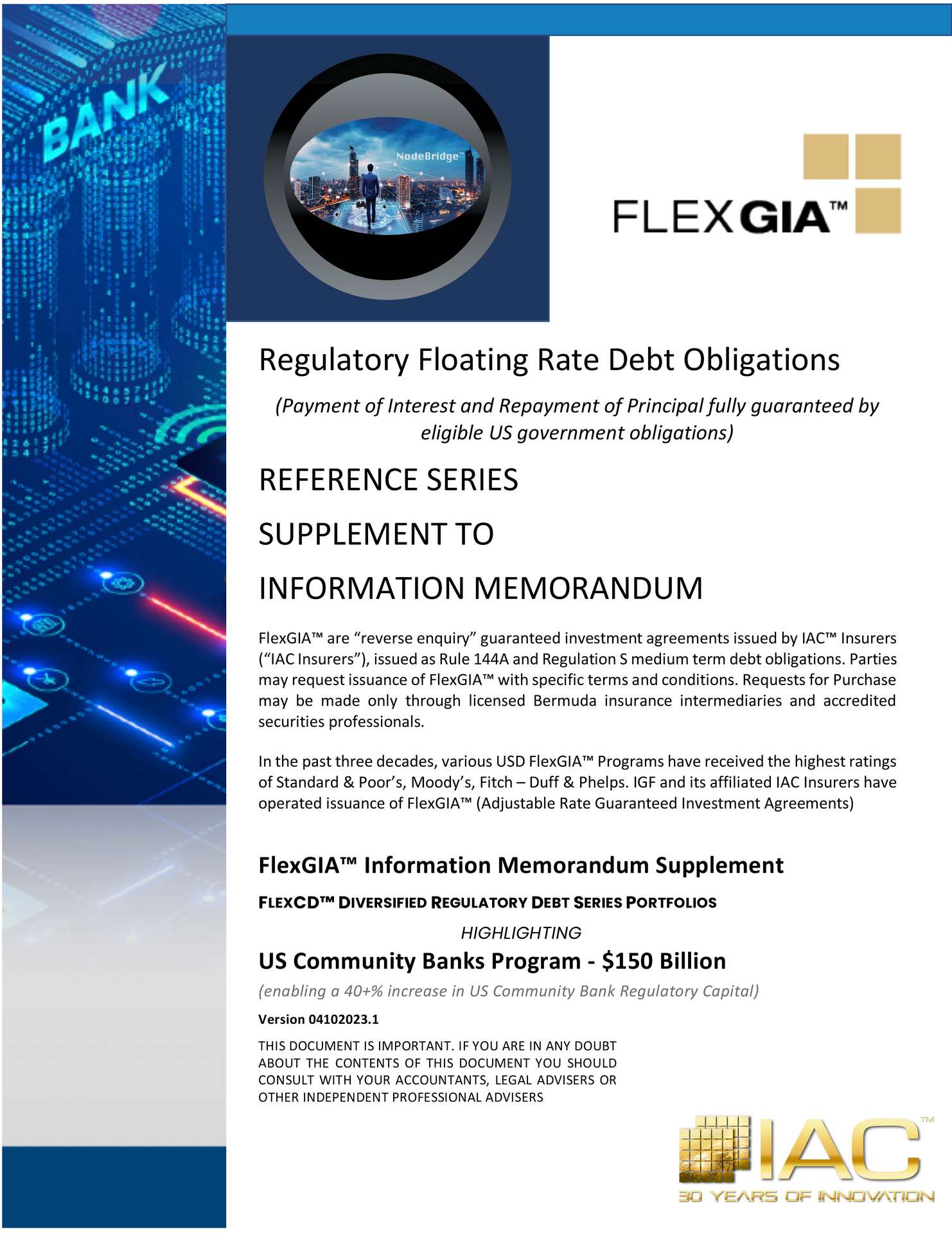 FlexGIA™ is a form of high credit quality, short duration, floating rate debt obligation issued by special purpose insurance companies, each an IAC™ Insurer. Myriad FlexGIA™ Series may be issued creating multiple strategies.