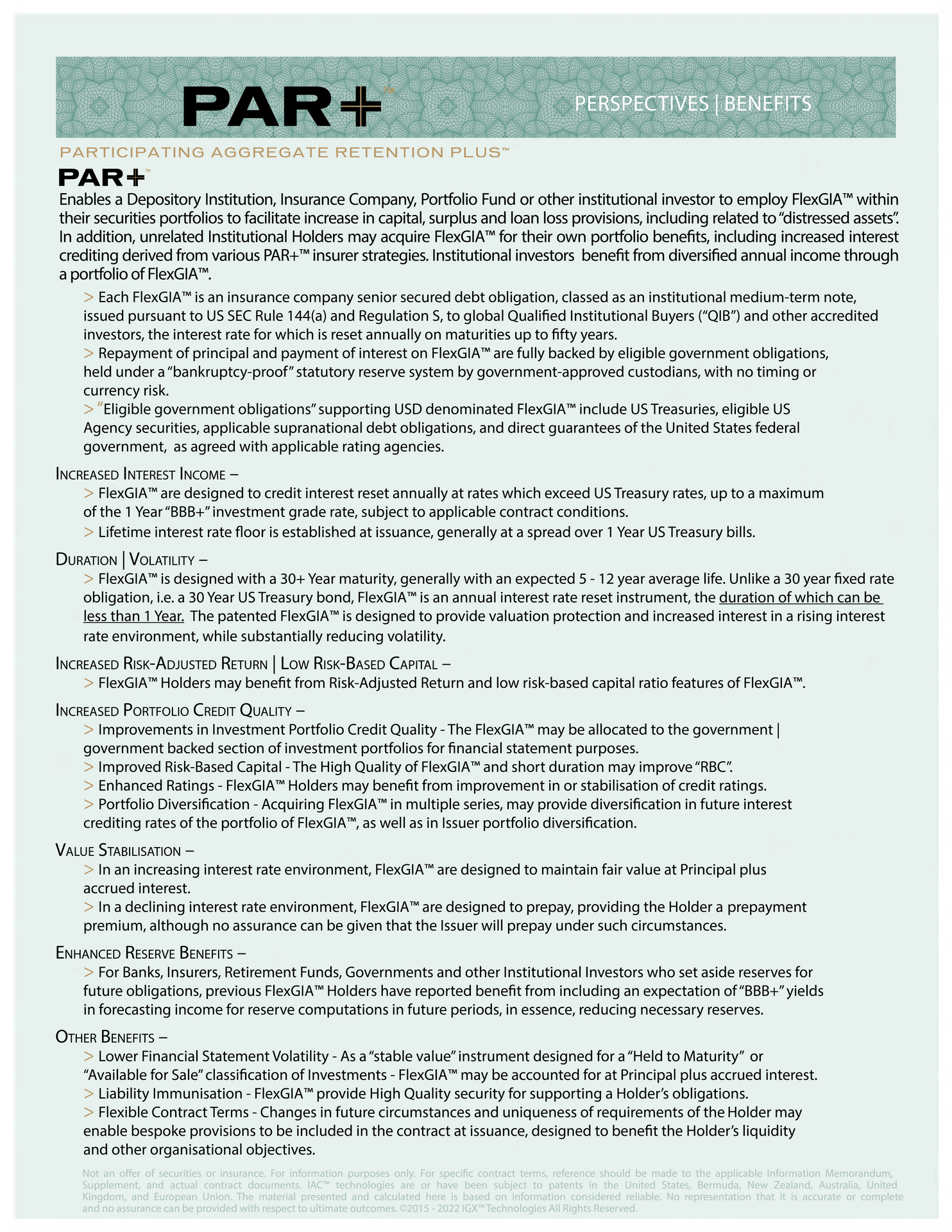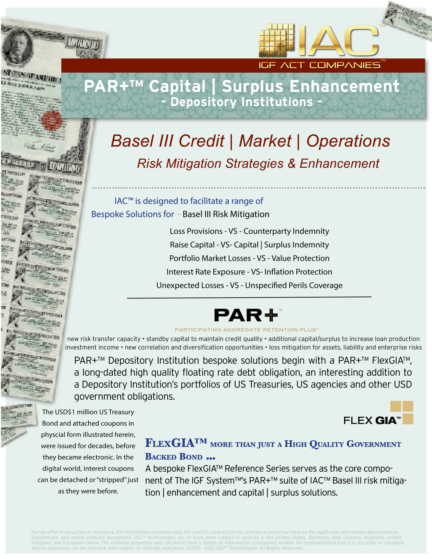 FlexGIA™ in conjunction with PAR+™ technologies, enable institutional portfolios, depository institutions, insurance companies, and other regulated institutional parties to not only increase risk adjusted return, enhance risk based capital, but to mitigate a wide range of risk exposures potentially impacting financial results.