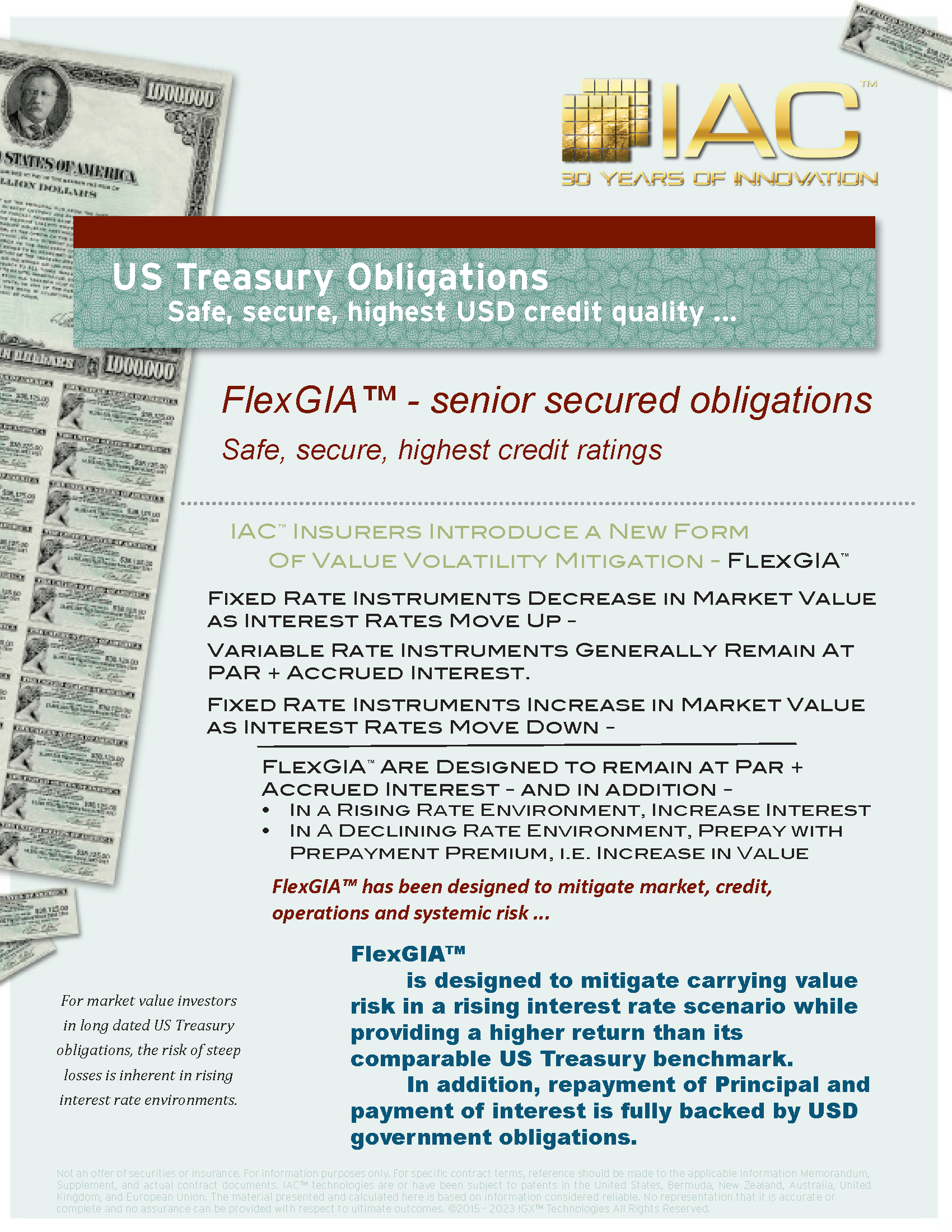 FlexGIA™ enable transformation of a variety of assets held by institutional parties into high quality floating rate debt obligations the interest on and repayment of Principal of which are fully backed by US Treasury | Agency obligations, with no timing or currency risk. This unique debt instrument mitigates market value risk, credit risk, operations risk, systemic risk and re-hypothecation risk exposures. Myriad types of instruments may be acquired by an IAC™ Insurer from banks, insurance companies, and portfolio funds creating Bespoke Series, Special Situations Series and other categories of FlexGIA™ Series.